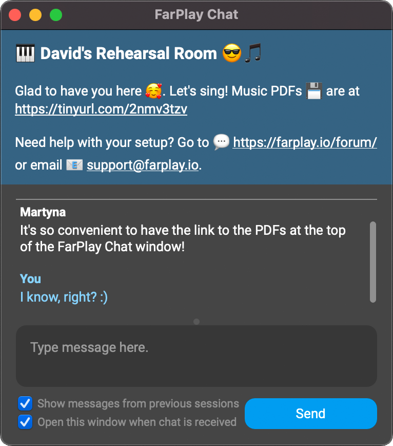 With a FarPlay for Teachers subscription, you can have up to ten Persistent Rooms. Thanks to the Chat Banner, each of these can now have its own dedicated identity. You might have one for your weekly jazz ensemble linking to lead sheets for example, and another for your students linking to a folder of exercises.
