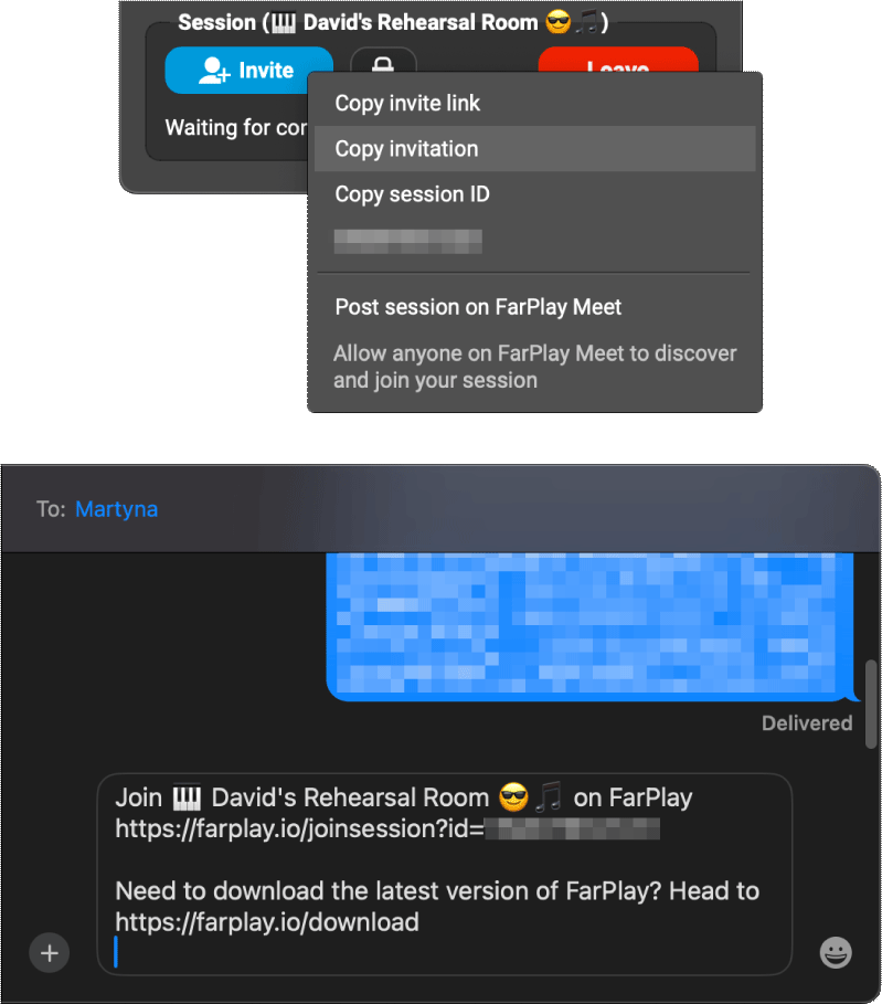 Click the Invite button and then click Copy invitation to copy an easy-to-read message (for emails and text messages, for example) that includes your FarPlay session’s name and link.
